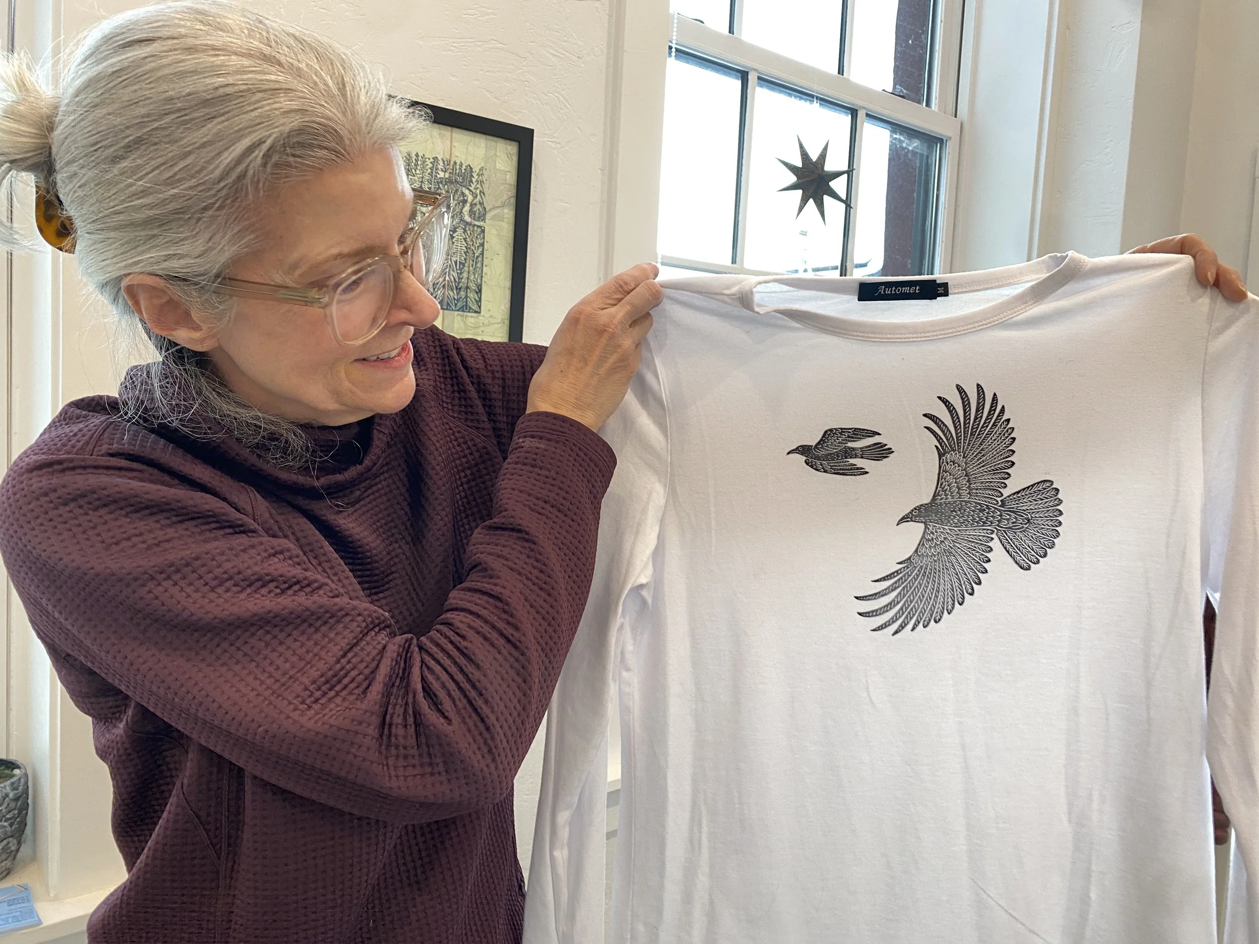 Ann Feldman holding her shirt with linocut crows by Jill Bergman